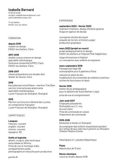 Diplômée de l’ENSCI-les Ateliers en 2024, j’ai principalement travaillé sur des projets dans le milieu de la santé et dans le domaines des espaces communs à la fois publics et privés. Que ce soit pour l’hôpital, pour une résidence étudiante ou un espace urbain, ce qui me tient à coeur est de proposer des solutions qui intègrent les usagers et le système d’acteurs qui rendent possible le projet. Ma pratique est tournée avant tout vers le terrain, que je cherche à rencontrer et comprendre. Tout au long de mon parcours j’ai acquis des outils d’analyse, de représentation et de conception qui me permettent de travailler différentes facettes d’un projet allant de l’immersion à la production finale.